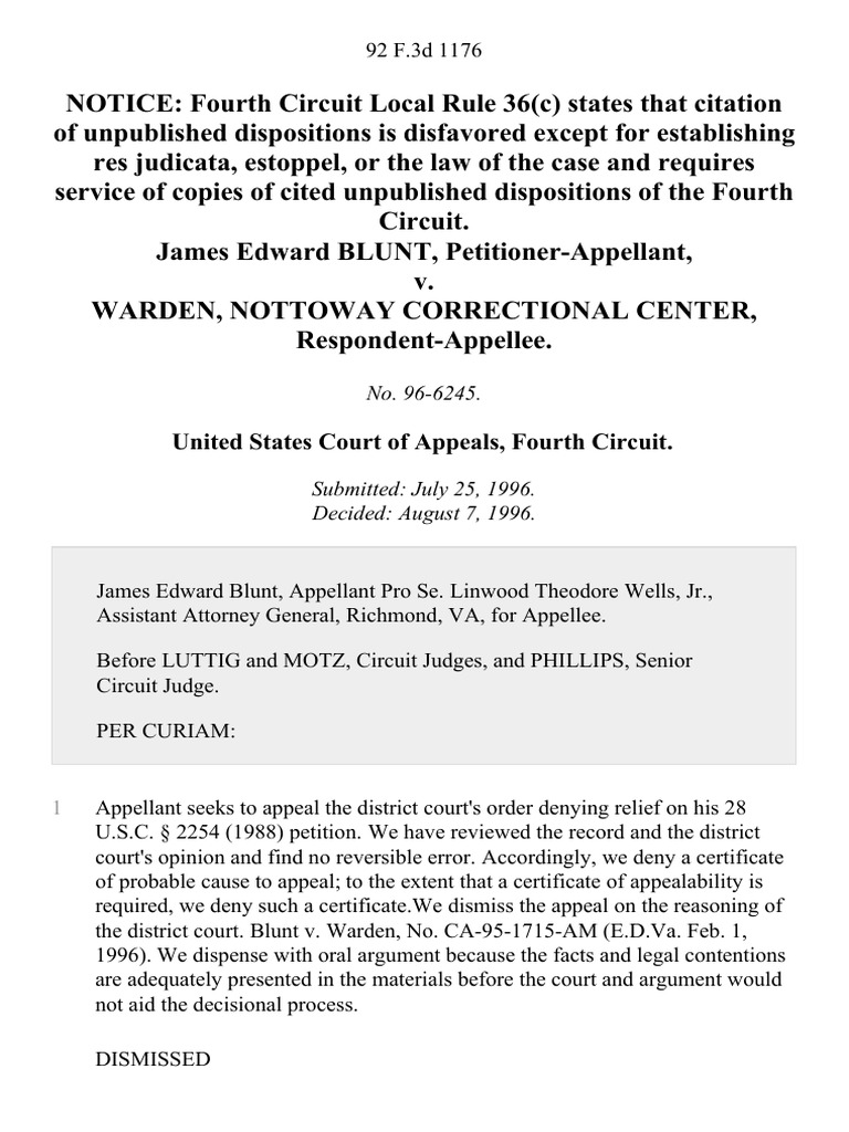 James Edward Blunt v. Warden, Nottoway Correctional Center, 92 F.3d