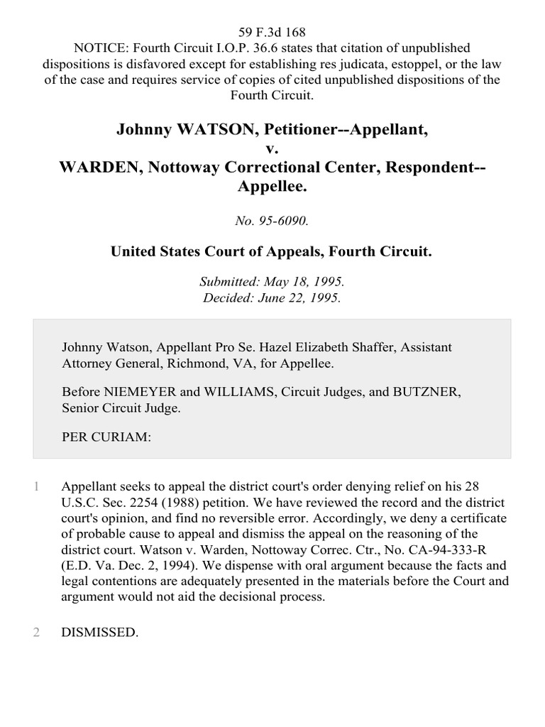 Johnny Watson v. Warden, Nottoway Correctional Center, 59 F.3d 168, 4th
