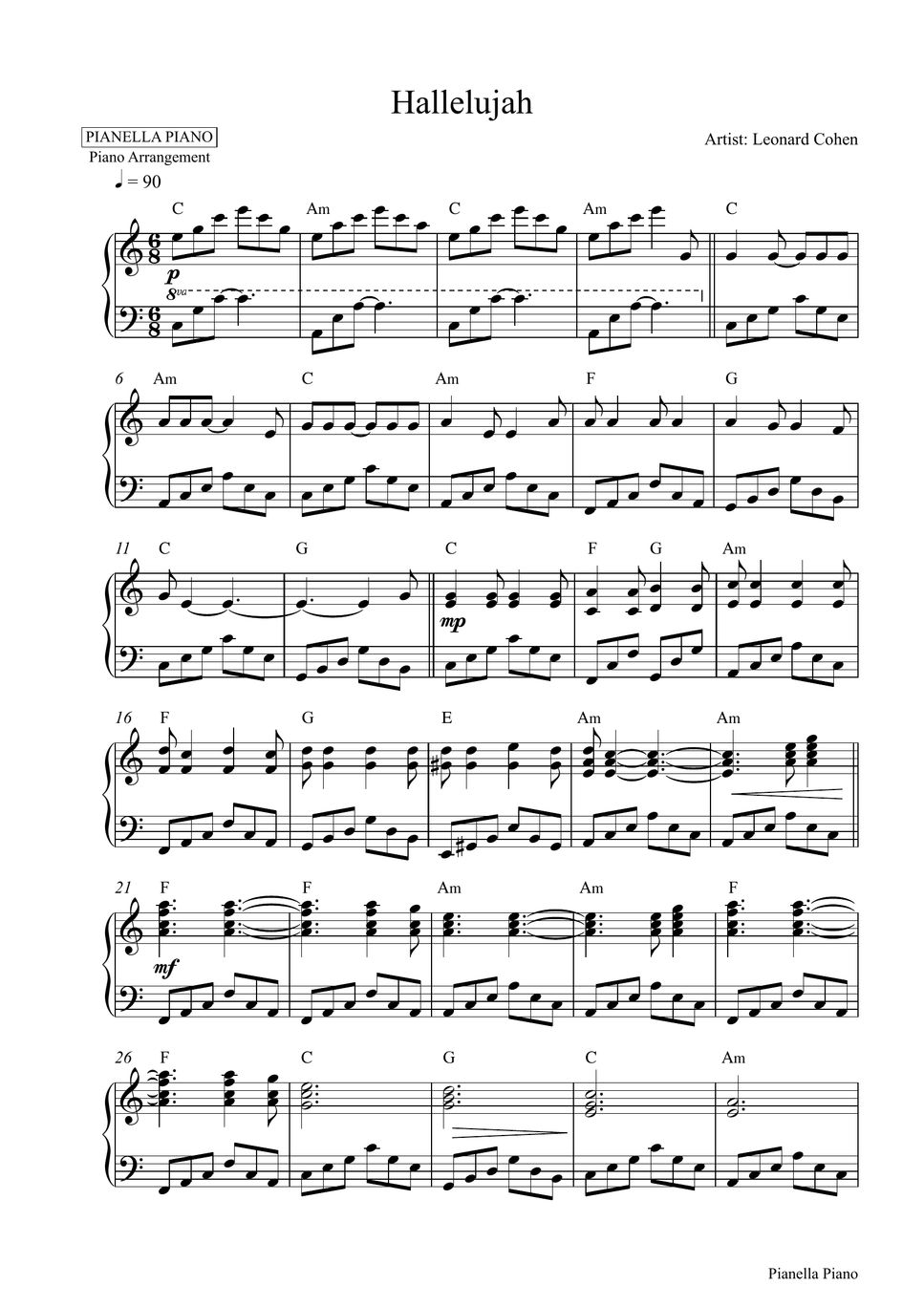 Leonard Cohen Hallelujah (Piano Sheet) Sheets by Pianella Piano