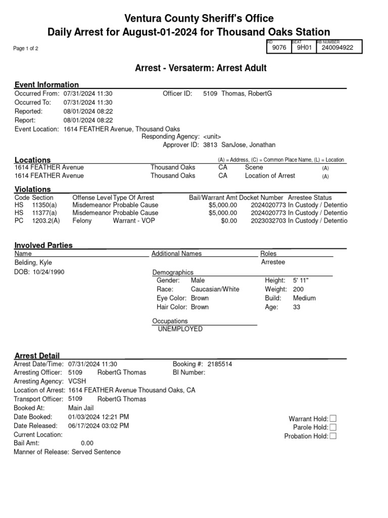 Ventura County Sheriff's Office Daily Arrest For August012024 For
