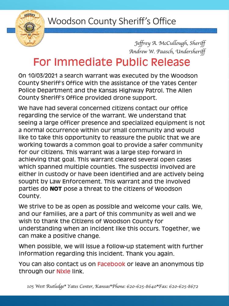 Search Warrant (10/07/2021) Press Releases Woodson County, Kansas
